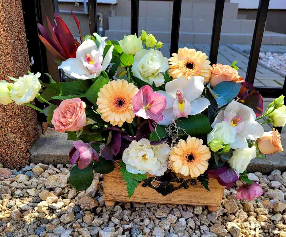 Acest aranjament floral elegant și sofisticat este compus din leucadendron subtil, cymbidium exotice, minigerbera jucaușe și eustoma delicate în culori pastelate. Leucadendron adaugă o notă subtilă și elegantă, cymbidium adaugă o notă exotică și sofisticată, minigerbera adaugă o notă vesele și jucause, iar eustoma adaugă o notă delicată și romantică. Aceste flori sunt aranjate cu grijă într-un aranjament frumos, care va aduce o notă de frumusețe și eleganță în orice încăpere. Acest aranjament floral este perfect pentru a decora o masă festivă, pentru a oferi un cadou special sau pentru a aduce o notă de rafinament în propriul cămin.