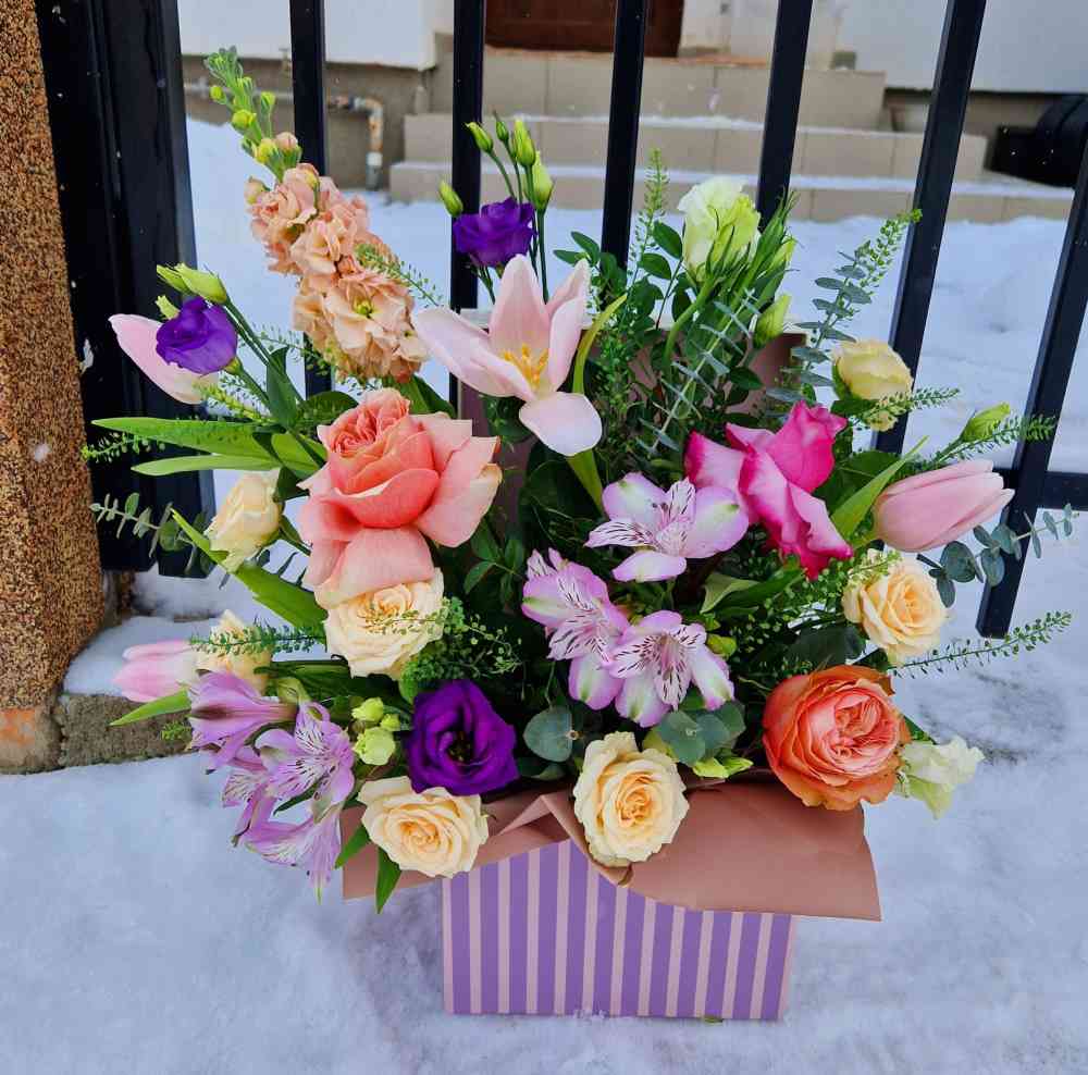 Acest aranjament floral elegant și rafinat este compus din trandafiri romantici, miniroze delicate, alstroemeri vibrante și eustoma subtile. Trandafirii adaugă o notă romantică și pasională, minirozele adaugă o notă de subtilitate și eleganță, alstroemeria adaugă o notă de culoare vibranta, în timp ce eustoma adaugă o notă delicată în culori pastelate. Aceste flori sunt aranjate cu grijă într-un buchet frumos, care va adăuga o notă de frumusețe și rafinament în orice încăpere. Acest aranjament floral este perfect pentru a decora o masă festivă, pentru a oferi un cadou special sau pentru a aduce un zâmbet pe fața cuiva drag.